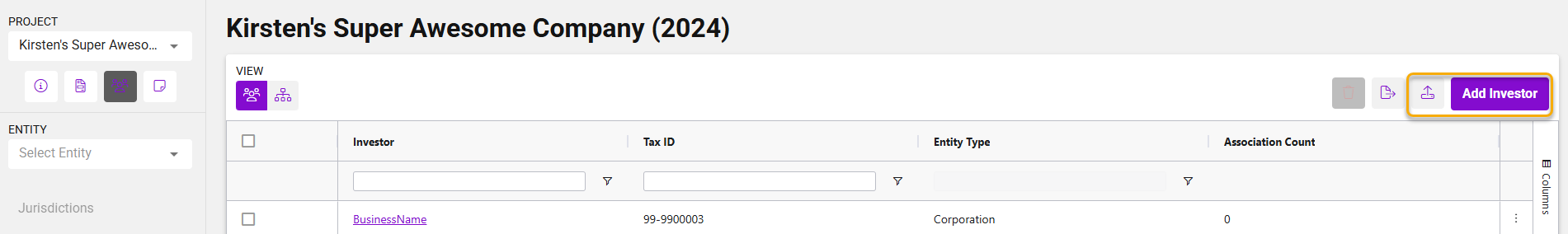 Upload all investors across the project and manually assign them to the relevant entities via the UI. -