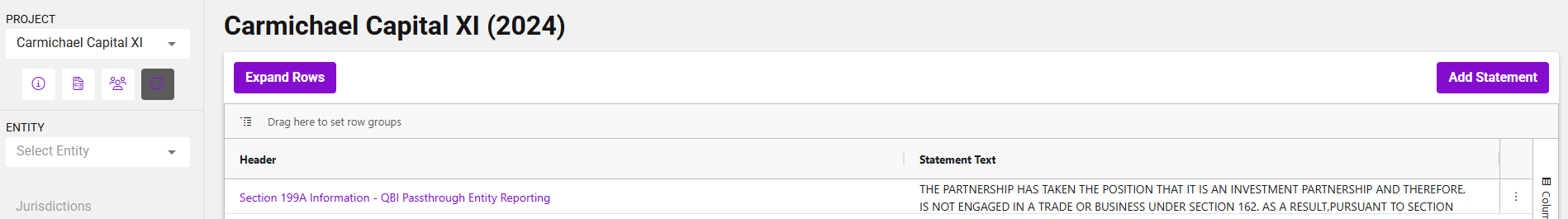 On the Footnotes page, you can begin building project-level statement templates to be used later in packaging. While not required to proceed with tax data setup, defining templates early can help standardize output across entities.