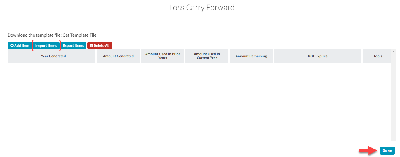 State Data Grid: Loss Carry Forward, Import Prior Year Data