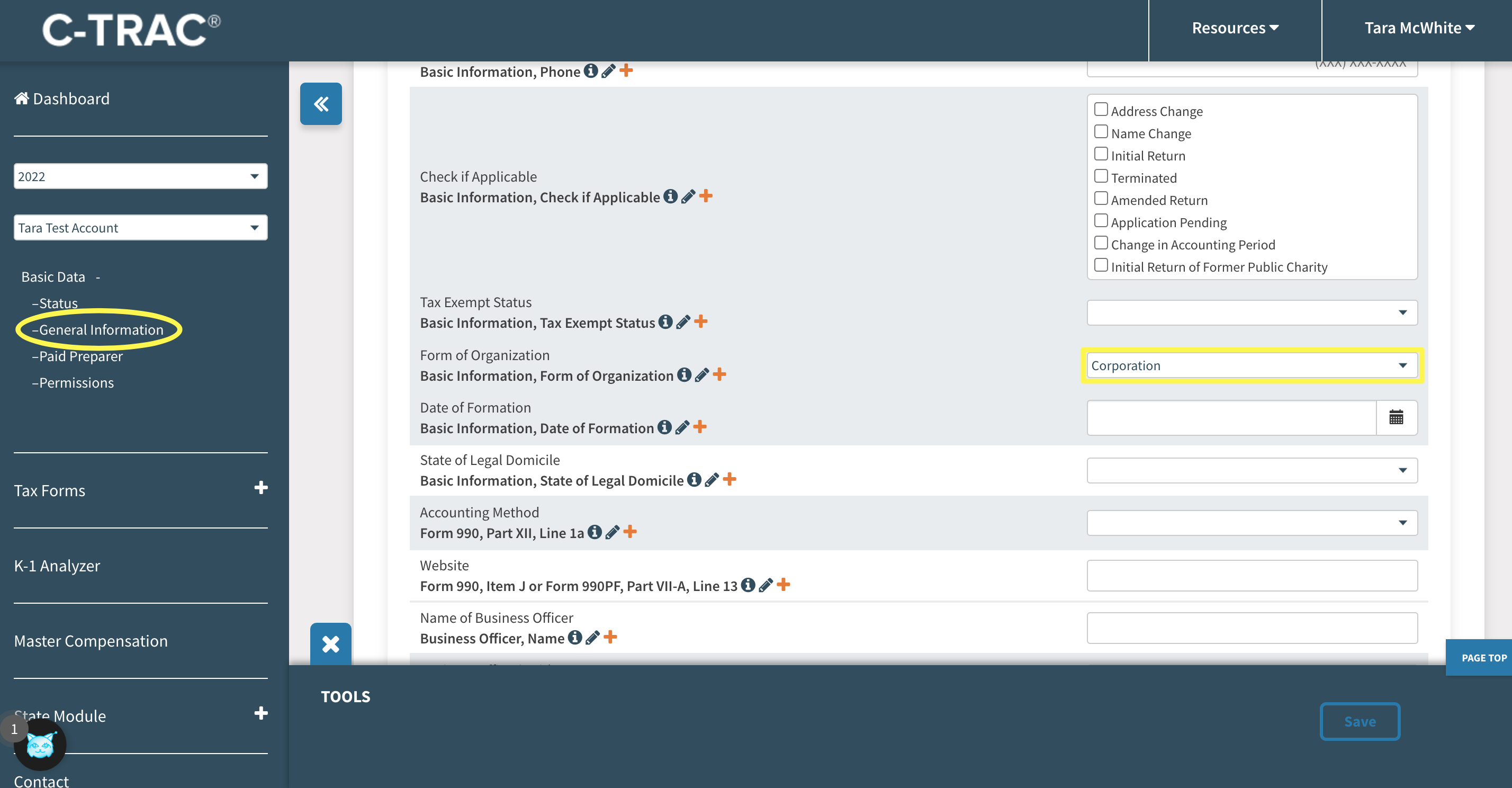 You will need to select either "Corporate" or "Trust" for the "Form of Organization" field in the General Information section to clear the 990-T 'SubsidiaryCorporationInd' error. Don't forget to save your changes.