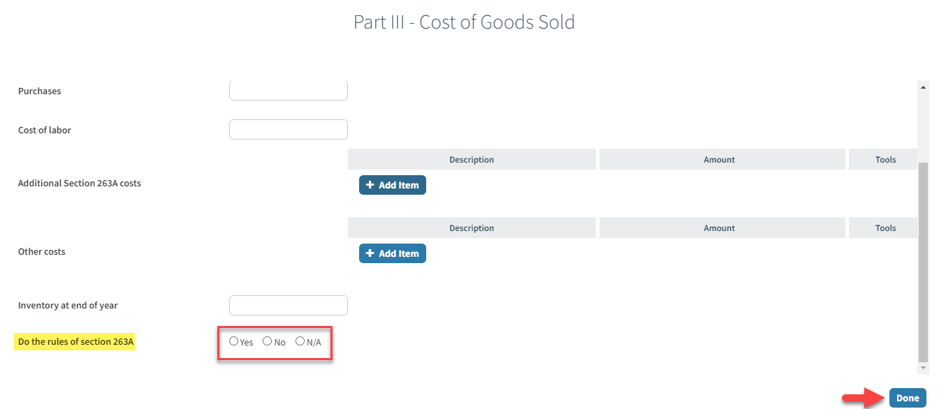 Follow the steps below to find and answer "Do the rules of section 263A (with respect to property produced or acquired for resale) apply to the organization?"